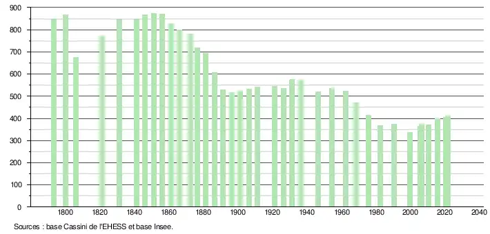 L'évolution du nombre d'habitants est connue à travers les recensements de la population effectués dans la commune depuis 1793. Pour les communes de moins de 10 000 habitants, une enquête de recensement portant sur toute la population est réalisée tous les cinq ans, les populations légales des années intermédiaires étant quant à elles estimées par interpolation ou extrapolation[25]. Pour la commune, le premier recensement exhaustif entrant dans le cadre du nouveau dispositif a été réalisé en 2005[26].