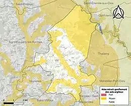 Le retrait-gonflement des sols argileux est susceptible d'engendrer des dommages importants aux bâtiments en cas d’alternance de périodes de sécheresse et de pluie. 57,5 % de la superficie communale est en aléa moyen ou fort (26,8 % au niveau départemental et 48,5 % au niveau national). Sur les 132 bâtiments dénombrés sur la commune en 2019, 18 sont en aléa moyen ou fort, soit 14 %, à comparer aux 36 % au niveau départemental et 54 % au niveau national. Une cartographie de l'exposition du territoire national au retrait gonflement des sols argileux est disponible sur le site du BRGM[16],[Carte 2].