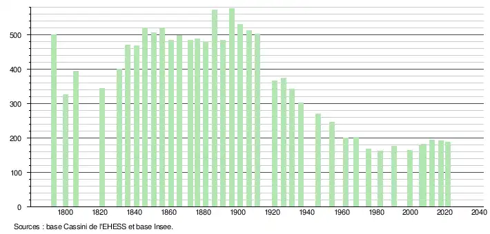 L'évolution du nombre d'habitants est connue à travers les recensements de la population effectués dans la commune depuis 1793. Pour les communes de moins de 10 000 habitants, une enquête de recensement portant sur toute la population est réalisée tous les cinq ans, les populations légales des années intermédiaires étant quant à elles estimées par interpolation ou extrapolation[22]. Pour la commune, le premier recensement exhaustif entrant dans le cadre du nouveau dispositif a été réalisé en 2007[23].