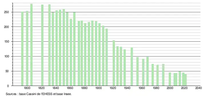 L'évolution du nombre d'habitants est connue à travers les recensements de la population effectués dans la commune depuis 1793. Pour les communes de moins de 10 000 habitants, une enquête de recensement portant sur toute la population est réalisée tous les cinq ans, les populations légales des années intermédiaires étant quant à elles estimées par interpolation ou extrapolation[24]. Pour la commune, le premier recensement exhaustif entrant dans le cadre du nouveau dispositif a été réalisé en 2008[25].