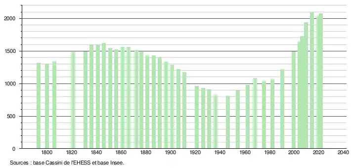 L'évolution du nombre d'habitants est connue à travers les recensements de la population effectués dans la commune depuis 1793. Pour les communes de moins de 10 000 habitants, une enquête de recensement portant sur toute la population est réalisée tous les cinq ans, les populations légales des années intermédiaires étant quant à elles estimées par interpolation ou extrapolation[26]. Pour la commune, le premier recensement exhaustif entrant dans le cadre du nouveau dispositif a été réalisé en 2004[27].