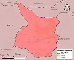 Le retrait-gonflement des sols argileux est susceptible d'engendrer des dommages importants aux bâtiments en cas d’alternance de périodes de sécheresse et de pluie. La totalité de la commune est en aléa moyen ou fort (94,5 % au niveau départemental et 48,5 % au niveau national). Sur les 43 bâtiments dénombrés sur la commune en 2019, 43 sont en aléa moyen ou fort, soit 100 %, à comparer aux 93 % au niveau départemental et 54 % au niveau national. Une cartographie de l'exposition du territoire national au retrait gonflement des sols argileux est disponible sur le site du BRGM[19],[Carte 3].