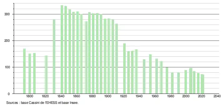 L'évolution du nombre d'habitants est connue à travers les recensements de la population effectués dans la commune depuis 1793. Pour les communes de moins de 10 000 habitants, une enquête de recensement portant sur toute la population est réalisée tous les cinq ans, les populations légales des années intermédiaires étant quant à elles estimées par interpolation ou extrapolation[22]. Pour la commune, le premier recensement exhaustif entrant dans le cadre du nouveau dispositif a été réalisé en 2005[23].