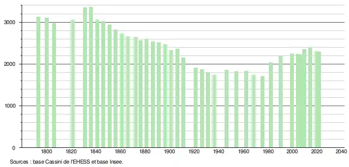 L'évolution du nombre d'habitants est connue à travers les recensements de la population effectués dans la commune depuis 1793. Pour les communes de moins de 10 000 habitants, une enquête de recensement portant sur toute la population est réalisée tous les cinq ans, les populations légales des années intermédiaires étant quant à elles estimées par interpolation ou extrapolation[21]. Pour la commune, le premier recensement exhaustif entrant dans le cadre du nouveau dispositif a été réalisé en 2004[22].