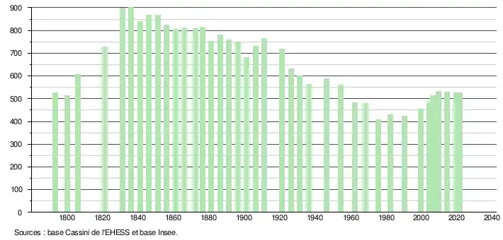 L'évolution du nombre d'habitants est connue à travers les recensements de la population effectués dans la commune depuis 1793. Pour les communes de moins de 10 000 habitants, une enquête de recensement portant sur toute la population est réalisée tous les cinq ans, les populations légales des années intermédiaires étant quant à elles estimées par interpolation ou extrapolation[17]. Pour la commune, le premier recensement exhaustif entrant dans le cadre du nouveau dispositif a été réalisé en 2004[18].