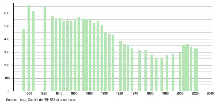 L'évolution du nombre d'habitants est connue à travers les recensements de la population effectués dans la commune depuis 1793. Pour les communes de moins de 10 000 habitants, une enquête de recensement portant sur toute la population est réalisée tous les cinq ans, les populations légales des années intermédiaires étant quant à elles estimées par interpolation ou extrapolation[20]. Pour la commune, le premier recensement exhaustif entrant dans le cadre du nouveau dispositif a été réalisé en 2004[21].