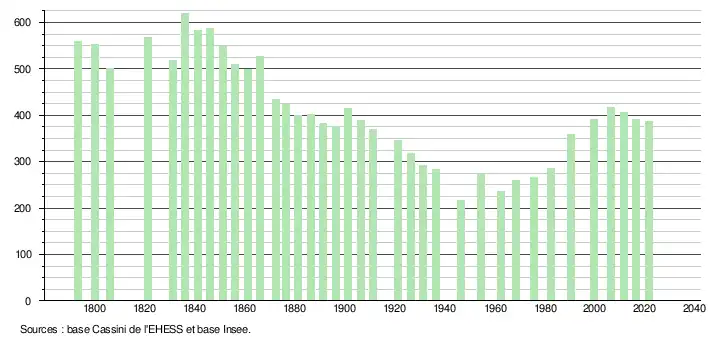 L'évolution du nombre d'habitants est connue à travers les recensements de la population effectués dans la commune depuis 1793. Pour les communes de moins de 10 000 habitants, une enquête de recensement portant sur toute la population est réalisée tous les cinq ans, les populations légales des années intermédiaires étant quant à elles estimées par interpolation ou extrapolation[17]. Pour la commune, le premier recensement exhaustif entrant dans le cadre du nouveau dispositif a été réalisé en 2006[18].
