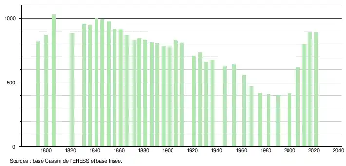 L'évolution du nombre d'habitants est connue à travers les recensements de la population effectués dans la commune depuis 1793. Pour les communes de moins de 10 000 habitants, une enquête de recensement portant sur toute la population est réalisée tous les cinq ans, les populations légales des années intermédiaires étant quant à elles estimées par interpolation ou extrapolation[17]. Pour la commune, le premier recensement exhaustif entrant dans le cadre du nouveau dispositif a été réalisé en 2006[18].