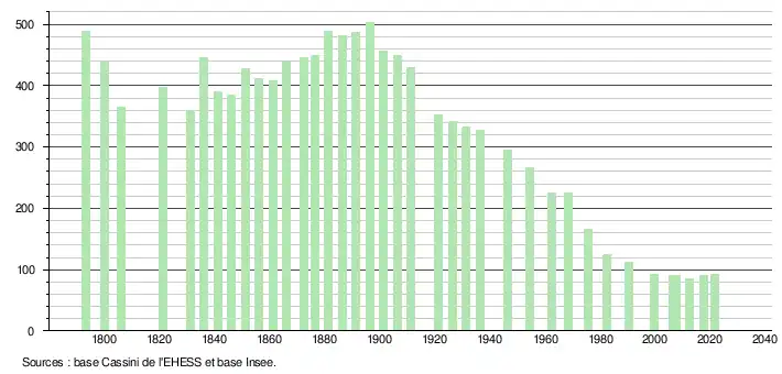 L'évolution du nombre d'habitants est connue à travers les recensements de la population effectués dans la commune depuis 1793. Pour les communes de moins de 10 000 habitants, une enquête de recensement portant sur toute la population est réalisée tous les cinq ans, les populations légales des années intermédiaires étant quant à elles estimées par interpolation ou extrapolation[21]. Pour la commune, le premier recensement exhaustif entrant dans le cadre du nouveau dispositif a été réalisé en 2007[22].