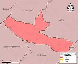 Le retrait-gonflement des sols argileux est susceptible d'engendrer des dommages importants aux bâtiments en cas d’alternance de périodes de sécheresse et de pluie. La totalité de la commune est en aléa moyen ou fort (94,5 % au niveau départemental et 48,5 % au niveau national). Sur les 69 bâtiments dénombrés sur la commune en 2019, 69 sont en aléa moyen ou fort, soit 100 %, à comparer aux 93 % au niveau départemental et 54 % au niveau national. Une cartographie de l'exposition du territoire national au retrait gonflement des sols argileux est disponible sur le site du BRGM[21],[Carte 3].