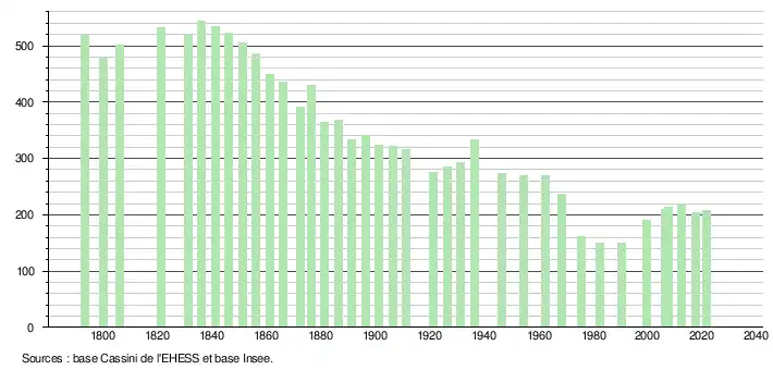 L'évolution du nombre d'habitants est connue à travers les recensements de la population effectués dans la commune depuis 1793. Pour les communes de moins de 10 000 habitants, une enquête de recensement portant sur toute la population est réalisée tous les cinq ans, les populations légales des années intermédiaires étant quant à elles estimées par interpolation ou extrapolation[20]. Pour la commune, le premier recensement exhaustif entrant dans le cadre du nouveau dispositif a été réalisé en 2007[21].