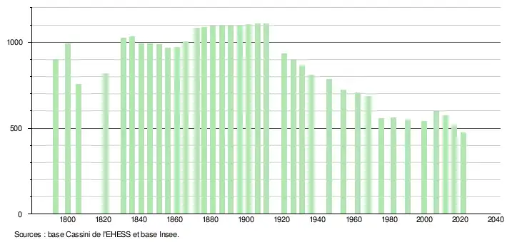 L'évolution du nombre d'habitants est connue à travers les recensements de la population effectués dans la commune depuis 1793. Pour les communes de moins de 10 000 habitants, une enquête de recensement portant sur toute la population est réalisée tous les cinq ans, les populations légales des années intermédiaires étant quant à elles estimées par interpolation ou extrapolation[41]. Pour la commune, le premier recensement exhaustif entrant dans le cadre du nouveau dispositif a été réalisé en 2006[42].