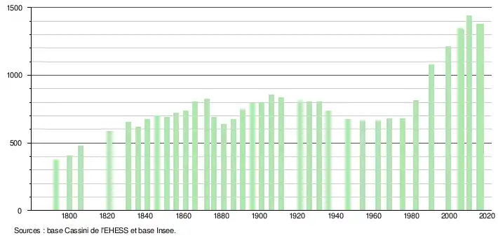 L'évolution du nombre d'habitants est connue à travers les recensements de la population effectués dans la commune depuis 1793. Pour les communes de moins de 10 000 habitants, une enquête de recensement portant sur toute la population est réalisée tous les cinq ans, les populations légales des années intermédiaires étant quant à elles estimées par interpolation ou extrapolation[9]. Pour la commune, le premier recensement exhaustif entrant dans le cadre du nouveau dispositif a été réalisé en 2005[10].