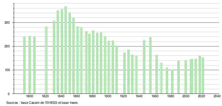 L'évolution du nombre d'habitants est connue à travers les recensements de la population effectués dans la commune depuis 1793. Pour les communes de moins de 10 000 habitants, une enquête de recensement portant sur toute la population est réalisée tous les cinq ans, les populations légales des années intermédiaires étant quant à elles estimées par interpolation ou extrapolation[26]. Pour la commune, le premier recensement exhaustif entrant dans le cadre du nouveau dispositif a été réalisé en 2007[27].