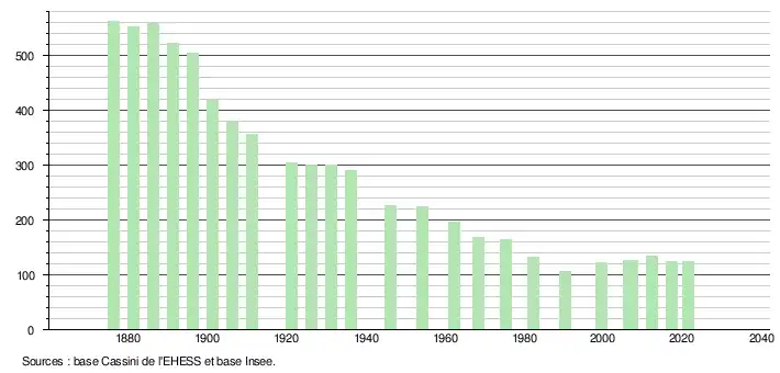 L'évolution du nombre d'habitants est connue à travers les recensements de la population effectués dans la commune depuis 1876. Pour les communes de moins de 10 000 habitants, une enquête de recensement portant sur toute la population est réalisée tous les cinq ans, les populations légales des années intermédiaires étant quant à elles estimées par interpolation ou extrapolation[34]. Pour la commune, le premier recensement exhaustif entrant dans le cadre du nouveau dispositif a été réalisé en 2007[35].