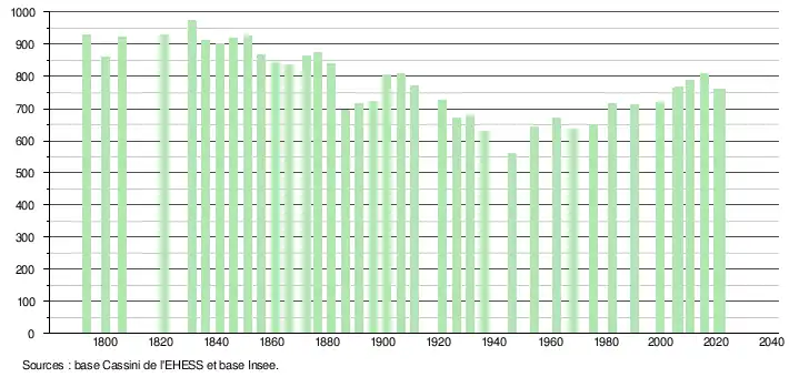 L'évolution du nombre d'habitants est connue à travers les recensements de la population effectués dans la commune depuis 1793. Pour les communes de moins de 10 000 habitants, une enquête de recensement portant sur toute la population est réalisée tous les cinq ans, les populations légales des années intermédiaires étant quant à elles estimées par interpolation ou extrapolation[21]. Pour la commune, le premier recensement exhaustif entrant dans le cadre du nouveau dispositif a été réalisé en 2005[22].