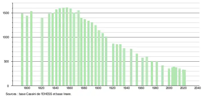 L'évolution du nombre d'habitants est connue à travers les recensements de la population effectués dans la commune depuis 1793. Pour les communes de moins de 10 000 habitants, une enquête de recensement portant sur toute la population est réalisée tous les cinq ans, les populations légales des années intermédiaires étant quant à elles estimées par interpolation ou extrapolation[29]. Pour la commune, le premier recensement exhaustif entrant dans le cadre du nouveau dispositif a été réalisé en 2004[30].