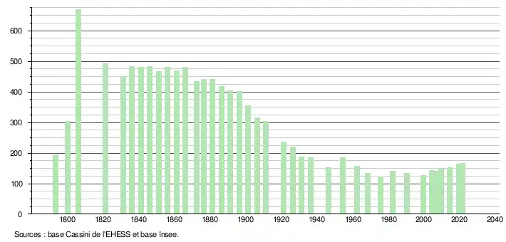 L'évolution du nombre d'habitants est connue à travers les recensements de la population effectués dans la commune depuis 1793. Pour les communes de moins de 10 000 habitants, une enquête de recensement portant sur toute la population est réalisée tous les cinq ans, les populations légales des années intermédiaires étant quant à elles estimées par interpolation ou extrapolation[30]. Pour la commune, le premier recensement exhaustif entrant dans le cadre du nouveau dispositif a été réalisé en 2004[31].