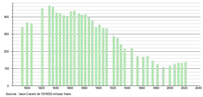 L'évolution du nombre d'habitants est connue à travers les recensements de la population effectués dans la commune depuis 1793. Pour les communes de moins de 10 000 habitants, une enquête de recensement portant sur toute la population est réalisée tous les cinq ans, les populations légales des années intermédiaires étant quant à elles estimées par interpolation ou extrapolation[16]. Pour la commune, le premier recensement exhaustif entrant dans le cadre du nouveau dispositif a été réalisé en 2006[17].