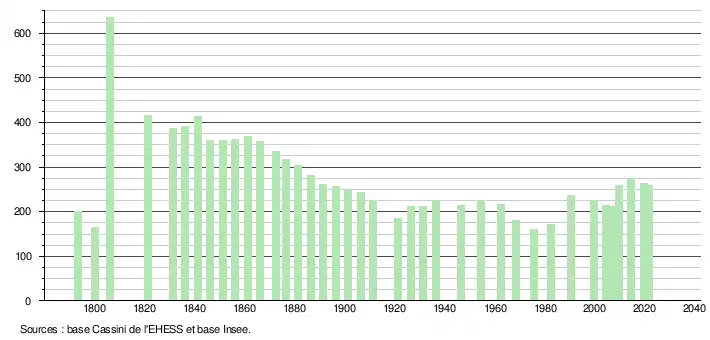 | L'évolution du nombre d'habitants est connue à travers les recensements de la population effectués dans la commune depuis 1793. Pour les communes de moins de 10 000 habitants, une enquête de recensement portant sur toute la population est réalisée tous les cinq ans, les populations légales des années intermédiaires étant quant à elles estimées par interpolation ou extrapolation[28]. Pour la commune, le premier recensement exhaustif entrant dans le cadre du nouveau dispositif a été réalisé en 2004[29]. En 2021, la commune comptait 258 habitants[Note 8], en diminution de 6,52 % par rapport à 2015 (Tarn-et-Garonne : +3,17 %, France hors Mayotte : +1,84 %). |