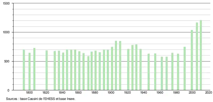 L'évolution du nombre d'habitants est connue à travers les recensements de la population effectués dans la commune depuis 1793. À partir du , les populations légales des communes sont publiées annuellement dans le cadre d'un recensement qui repose désormais sur une collecte d'information annuelle, concernant successivement tous les territoires communaux au cours d'une période de cinq ans. Pour les communes de moins de 10 000 habitants, une enquête de recensement portant sur toute la population est réalisée tous les cinq ans, les populations légales des années intermédiaires étant quant à elles estimées par interpolation ou extrapolation[6]. Pour la commune, le premier recensement exhaustif entrant dans le cadre du nouveau dispositif a été réalisé en 2005[7],[Note 1].