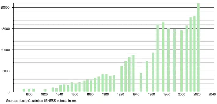 - Par convention dans Wikipédia, le principe a été retenu de n’afficher dans le tableau des recensements et le graphique, pour les populations légales postérieures à 1999, que les populations correspondant à une enquête exhaustive de recensement pour les communes de moins de 10 000 habitants, et que les populations des années 2006, 2011, 2016, etc. pour les communes de plus de 10 000 habitants, ainsi que la dernière population légale publiée par l’Insee pour l'ensemble des communes.