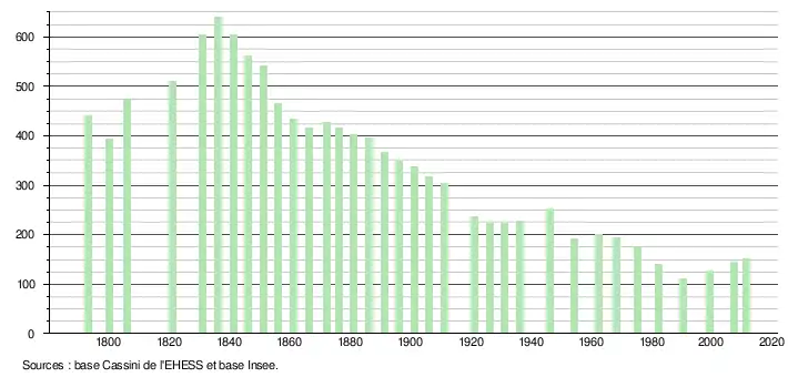 - Dans le tableau des recensements et le graphique, par convention dans Wikipédia, le principe a été retenu, pour les populations légales postérieures à 1999 de n’afficher dans le tableau des recensements et le graphique que les populations correspondant à l'année 2006, première population légale publiée calculée conformément aux concepts définis dans le décret no 2003-485 du 5 juin 2003, et les années correspondant à une enquête exhaustive de recensement pour les communes de moins de 10 000 habitants, ainsi que la dernière population légale publiée par l’Insee.