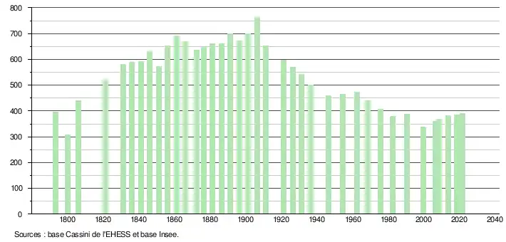 L'évolution du nombre d'habitants est connue à travers les recensements de la population effectués dans la commune depuis 1793. Pour les communes de moins de 10 000 habitants, une enquête de recensement portant sur toute la population est réalisée tous les cinq ans, les populations légales des années intermédiaires étant quant à elles estimées par interpolation ou extrapolation[16]. Pour la commune, le premier recensement exhaustif entrant dans le cadre du nouveau dispositif a été réalisé en 2008[17].