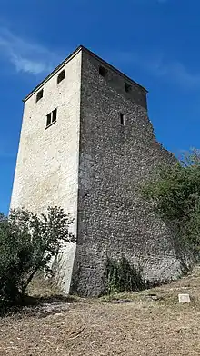Le donjon, restauré, fait partie d'un ancien château fort possédé au début du XIVe siècle par les dauphins de Viennois[37]. La forteresse originelle, faite de terre et de bois, date du XIIIe siècle. Cette construction militaire dépend alors du château de Saint-Sorlin-en-Bugey.