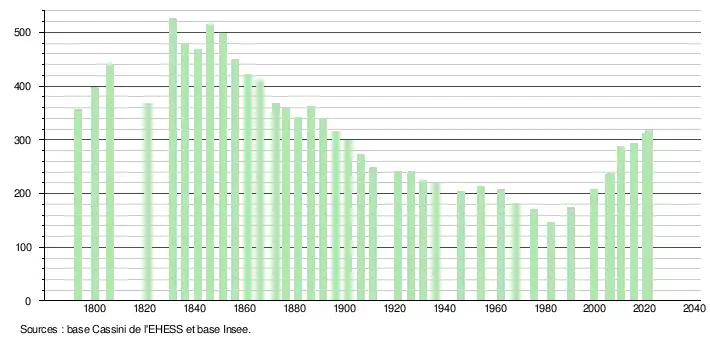L'évolution du nombre d'habitants est connue à travers les recensements de la population effectués dans la commune depuis 1793. Pour les communes de moins de 10 000 habitants, une enquête de recensement portant sur toute la population est réalisée tous les cinq ans, les populations légales des années intermédiaires étant quant à elles estimées par interpolation ou extrapolation[21]. Pour la commune, le premier recensement exhaustif entrant dans le cadre du nouveau dispositif a été réalisé en 2005[22].