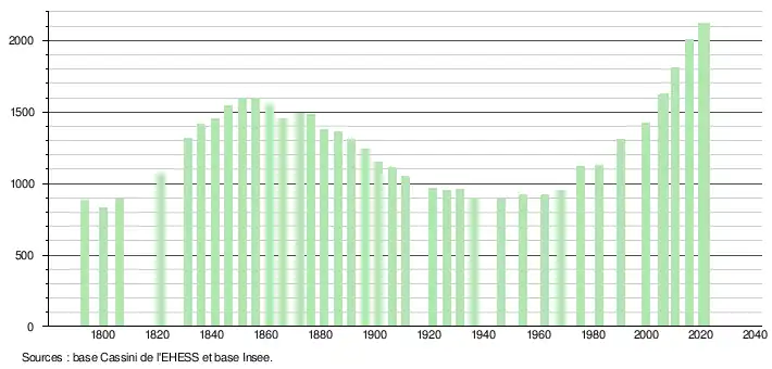 L'évolution du nombre d'habitants est connue à travers les recensements de la population effectués dans la commune depuis 1793. Pour les communes de moins de 10 000 habitants, une enquête de recensement portant sur toute la population est réalisée tous les cinq ans, les populations légales des années intermédiaires étant quant à elles estimées par interpolation ou extrapolation[29]. Pour la commune, le premier recensement exhaustif entrant dans le cadre du nouveau dispositif a été réalisé en 2005[30].