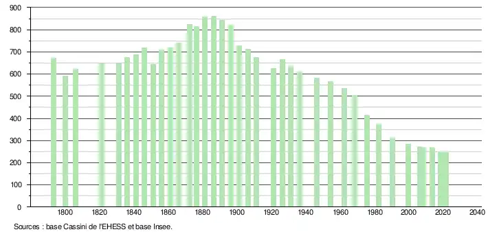L'évolution du nombre d'habitants est connue à travers les recensements de la population effectués dans la commune depuis 1793. Pour les communes de moins de 10 000 habitants, une enquête de recensement portant sur toute la population est réalisée tous les cinq ans, les populations légales des années intermédiaires étant quant à elles estimées par interpolation ou extrapolation[17]. Pour la commune, le premier recensement exhaustif entrant dans le cadre du nouveau dispositif a été réalisé en 2008[18].