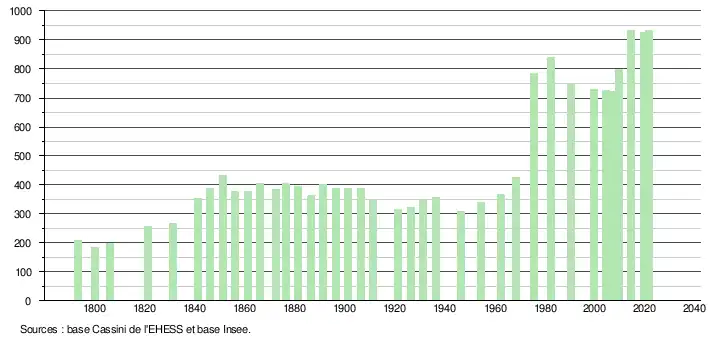 L'évolution du nombre d'habitants est connue à travers les recensements de la population effectués dans la commune depuis 1793. Pour les communes de moins de 10 000 habitants, une enquête de recensement portant sur toute la population est réalisée tous les cinq ans, les populations légales des années intermédiaires étant quant à elles estimées par interpolation ou extrapolation[24]. Pour la commune, le premier recensement exhaustif entrant dans le cadre du nouveau dispositif a été réalisé en 2004[25].