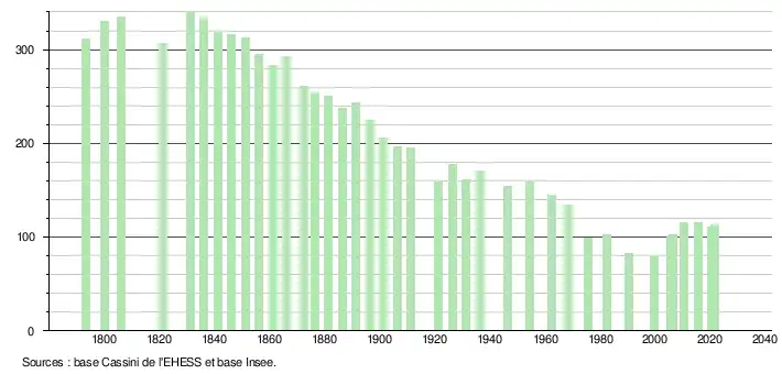 L'évolution du nombre d'habitants est connue à travers les recensements de la population effectués dans la commune depuis 1793. Pour les communes de moins de 10 000 habitants, une enquête de recensement portant sur toute la population est réalisée tous les cinq ans, les populations légales des années intermédiaires étant quant à elles estimées par interpolation ou extrapolation[18]. Pour la commune, le premier recensement exhaustif entrant dans le cadre du nouveau dispositif a été réalisé en 2005[19].