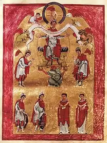 Portrait d'Otton II sur l'évangéliaire de Liuthar d'Aix-la-Chapelle, au chapitre épiscopal d'Aix. Il est souvent considéré comme le plus impressionnant témoignage de la sacralisation du pouvoir : l'empereur y adopte les attributs christiques à un tel degré qu'il est à peine possible de le distinguer du Messie. La sacralisation de la royauté connut son apogée sous Otton III (miniature du scriptorium de Reichenau, début du XIe siècle).