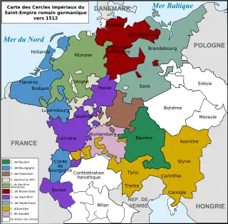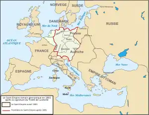 Le Saint-Empire romain germanique, selon la terminologie francophone usuelle[14], est un État d'Europe ayant existé de 962 (couronnement d'Otton Ier) à 1806 (abdication de François II). Cet État, issu de la décomposition de l'Empire carolingien, a joué un rôle important dans l'histoire de l'Europe au Moyen Âge, notamment du fait du conflit entre les empereurs et les papes, et pendant les Temps modernes. Sa disparition aboutit à l'établissement de l'empire d'Autriche (empire d'Autriche-Hongrie à partir de 1867) et de la Confédération du Rhin, à laquelle succédera la Confédération germanique (1815) puis l'Empire allemand (1871).