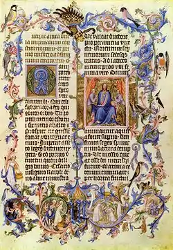 La formule latine sacrum Romanum imperium apparaît sous Frédéric Barberousse. Elle est attestée dès  : sa première occurrence connue  le génitif « sacri romani imperii »  figure dans un diplôme daté du et dont l'original, provenant du fonds de l'église romaine Santa Maria in Via Lata, est conservé à la Bibliothèque apostolique vaticane[36],[37],[N 5]. Pendant l'interrègne de 1250 à 1273, lorsque aucun des trois rois élus n'est parvenu à s'imposer par rapport aux autres, l'Empire se réclame de l'Empire romain avec le qualificatif « saint ». À partir de 1254, on utilise la dénomination latine Sacrum Romanum Imperium (en allemand Heiliges Römisches Reich)[38]. Il faut attendre le règne de Charles IV pour la voir utilisée dans des documents en langue allemande. C'est précisément pendant la période sans empereur au milieu du XIIIe siècle que la volonté d'un pouvoir universel s'est le plus affirmée — même si cette situation a peu changé par la suite.