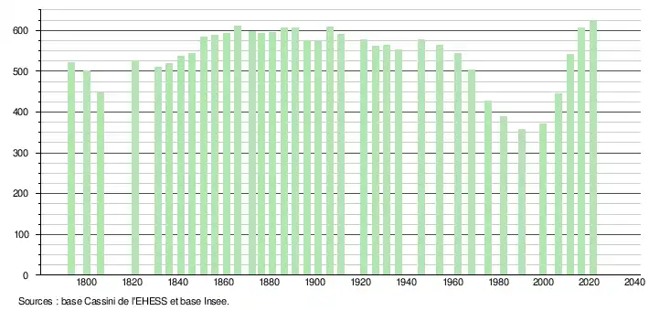 L'évolution du nombre d'habitants est connue à travers les recensements de la population effectués dans la commune depuis 1793. Pour les communes de moins de 10 000 habitants, une enquête de recensement portant sur toute la population est réalisée tous les cinq ans, les populations légales des années intermédiaires étant quant à elles estimées par interpolation ou extrapolation[16]. Pour la commune, le premier recensement exhaustif entrant dans le cadre du nouveau dispositif a été réalisé en 2006[17].