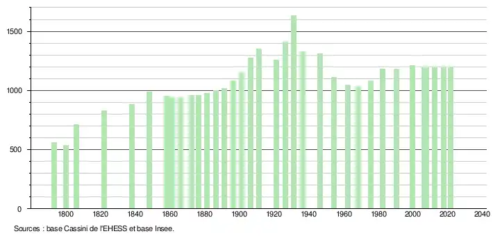 L'évolution du nombre d'habitants est connue à travers les recensements de la population effectués dans la commune depuis 1793. Pour les communes de moins de 10 000 habitants, une enquête de recensement portant sur toute la population est réalisée tous les cinq ans, les populations légales des années intermédiaires étant quant à elles estimées par interpolation ou extrapolation[13]. Pour la commune, le premier recensement exhaustif entrant dans le cadre du nouveau dispositif a été réalisé en 2007[14].