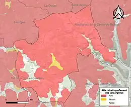 Les mouvements de terrains susceptibles de se produire sur la commune sont des tassements différentiels[35]. Le retrait-gonflement des sols argileux est susceptible d'engendrer des dommages importants aux bâtiments en cas d’alternance de périodes de sécheresse et de pluie[36]. 86,2 % de la superficie communale est en aléa moyen ou fort (58,6 % au niveau départemental et 48,5 % au niveau national métropolitain)[Carte 4]. Depuis le , en application de la loi ÉLAN, différentes contraintes s'imposent aux vendeurs, maîtres d'ouvrages ou constructeurs de biens situés dans une zone classée en aléa moyen ou fort[Note 4],[37].