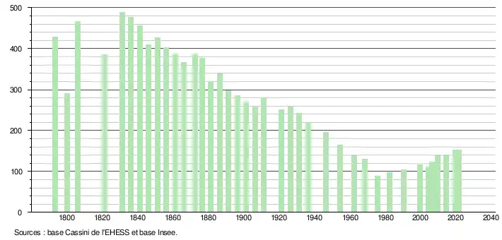 | L'évolution du nombre d'habitants est connue à travers les recensements de la population effectués dans la commune depuis 1793. Pour les communes de moins de 10 000 habitants, une enquête de recensement portant sur toute la population est réalisée tous les cinq ans, les populations légales des années intermédiaires étant quant à elles estimées par interpolation ou extrapolation[43]. Pour la commune, le premier recensement exhaustif entrant dans le cadre du nouveau dispositif a été réalisé en 2004[44]. En 2021, la commune comptait 152 habitants[Note 8], en augmentation de 9,35 % par rapport à 2015 (Ariège : +1,38 %, France hors Mayotte : +1,84 %). |