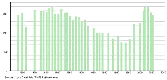 L'évolution du nombre d'habitants est connue à travers les recensements de la population effectués dans la commune depuis 1793. Pour les communes de moins de 10 000 habitants, une enquête de recensement portant sur toute la population est réalisée tous les cinq ans, les populations légales des années intermédiaires étant quant à elles estimées par interpolation ou extrapolation[25]. Pour la commune, le premier recensement exhaustif entrant dans le cadre du nouveau dispositif a été réalisé en 2008[26].
