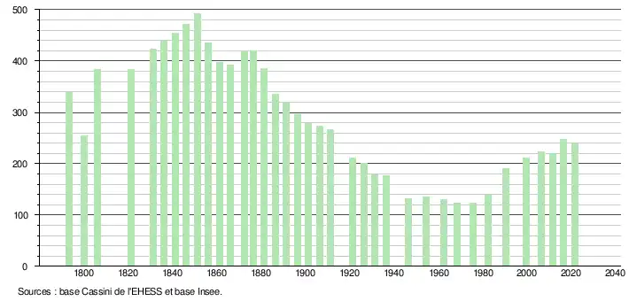 L'évolution du nombre d'habitants est connue à travers les recensements de la population effectués dans la commune depuis 1793. Pour les communes de moins de 10 000 habitants, une enquête de recensement portant sur toute la population est réalisée tous les cinq ans, les populations légales des années intermédiaires étant quant à elles estimées par interpolation ou extrapolation[25]. Pour la commune, le premier recensement exhaustif entrant dans le cadre du nouveau dispositif a été réalisé en 2006[26].