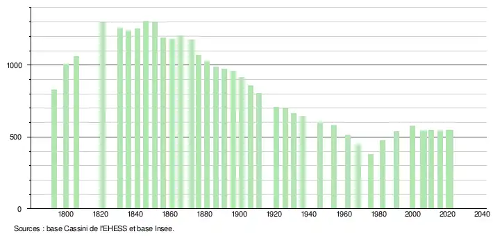 L'évolution du nombre d'habitants est connue à travers les recensements de la population effectués dans la commune depuis 1793. Pour les communes de moins de 10 000 habitants, une enquête de recensement portant sur toute la population est réalisée tous les cinq ans, les populations légales des années intermédiaires étant quant à elles estimées par interpolation ou extrapolation[19]. Pour la commune, le premier recensement exhaustif entrant dans le cadre du nouveau dispositif a été réalisé en 2005[20].