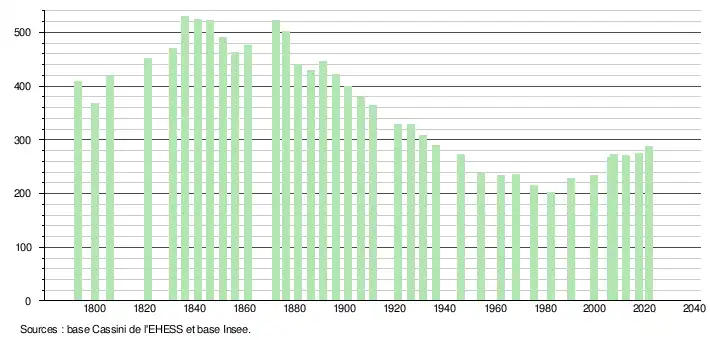 L'évolution du nombre d'habitants est connue à travers les recensements de la population effectués dans la commune depuis 1793. Pour les communes de moins de 10 000 habitants, une enquête de recensement portant sur toute la population est réalisée tous les cinq ans, les populations légales des années intermédiaires étant quant à elles estimées par interpolation ou extrapolation[15]. Pour la commune, le premier recensement exhaustif entrant dans le cadre du nouveau dispositif a été réalisé en 2007[16].