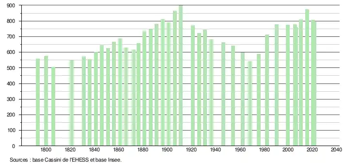 L'évolution du nombre d'habitants est connue à travers les recensements de la population effectués dans la commune depuis 1793. Pour les communes de moins de 10 000 habitants, une enquête de recensement portant sur toute la population est réalisée tous les cinq ans, les populations légales des années intermédiaires étant quant à elles estimées par interpolation ou extrapolation[18]. Pour la commune, le premier recensement exhaustif entrant dans le cadre du nouveau dispositif a été réalisé en 2005[19].