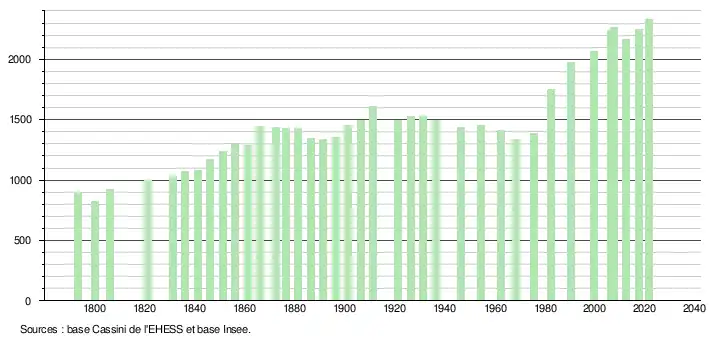 L'évolution du nombre d'habitants est connue à travers les recensements de la population effectués dans la commune depuis 1793. Pour les communes de moins de 10 000 habitants, une enquête de recensement portant sur toute la population est réalisée tous les cinq ans, les populations légales des années intermédiaires étant quant à elles estimées par interpolation ou extrapolation[49]. Pour la commune, le premier recensement exhaustif entrant dans le cadre du nouveau dispositif a été réalisé en 2007[50].