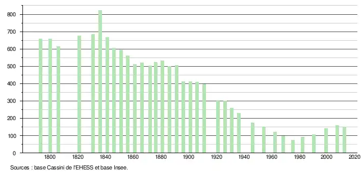 L'évolution du nombre d'habitants est connue à travers les recensements de la population effectués dans la commune depuis 1793. À partir du , les populations légales des communes sont publiées annuellement dans le cadre d'un recensement qui repose désormais sur une collecte d'information annuelle, concernant successivement tous les territoires communaux au cours d'une période de cinq ans. Pour les communes de moins de 10 000 habitants, une enquête de recensement portant sur toute la population est réalisée tous les cinq ans, les populations légales des années intermédiaires étant quant à elles estimées par interpolation ou extrapolation[4]. Pour la commune, le premier recensement exhaustif entrant dans le cadre du nouveau dispositif a été réalisé en 2007[5],[Note 1].