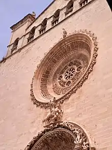 La façade a été reconstruite au XVIIe siècle par Francisco de Herrera en 1690. Le portail est baroque. Le tympan et la rosace sont du vitrier Pere Comas.