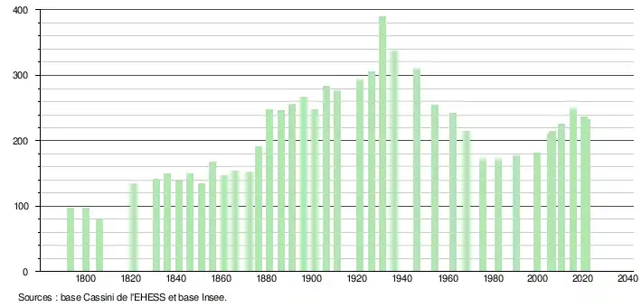 | L'évolution du nombre d'habitants est connue à travers les recensements de la population effectués dans la commune depuis 1793. Pour les communes de moins de 10 000 habitants, une enquête de recensement portant sur toute la population est réalisée tous les cinq ans, les populations légales des années intermédiaires étant quant à elles estimées par interpolation ou extrapolation[23]. Pour la commune, le premier recensement exhaustif entrant dans le cadre du nouveau dispositif a été réalisé en 2005[24]. En 2021, la commune comptait 233 habitants[Note 5], en diminution de 6,43 % par rapport à 2015 (Aude : +2,47 %, France hors Mayotte : +1,84 %). |